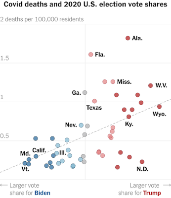 If you've forgotten how to read graphs, the results are clear. Those states voting for Donald Trump are killing themselves by avoiding being vaccinated. How serious is this? Almost a factor of 5.