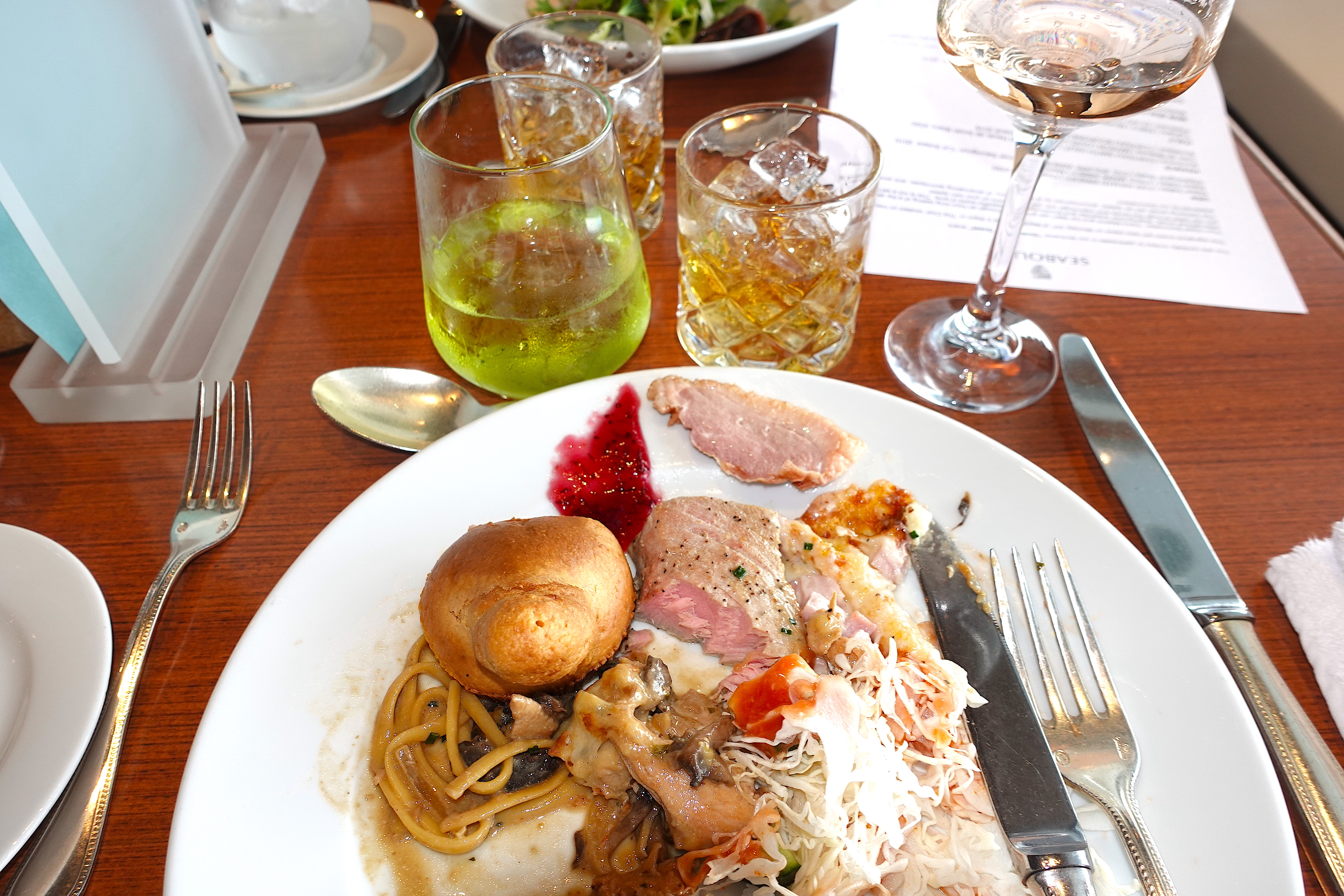 You haven't really lived until you've been well inebriated at lunchtime on the Seabourn Odyssey. Here a medley of pastas, tuna, chicken and salad, accompanied by some green Irish cocktail, Jameson and a rosé wine.
