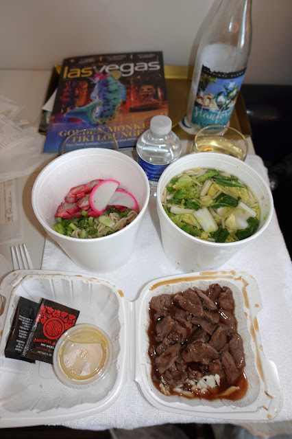 Had meals today from the California Hotel. First a take-out of saimin (my computer insists this should be simian, and keeps changing it) and BBQ.
