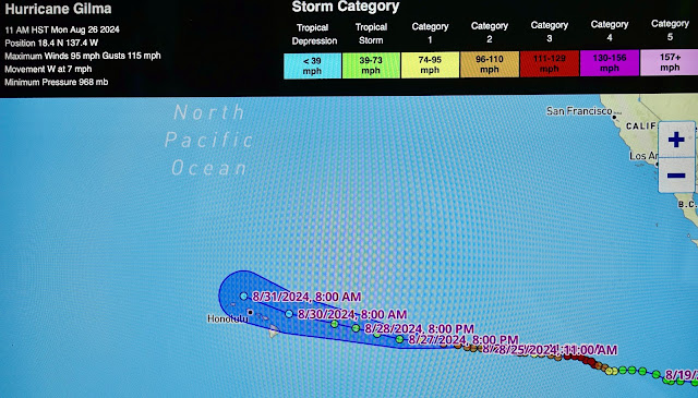 Hurricane Gilma was at 100 MPH earlier today, but again today as yesterday, jumped back up to 110 MPH, Highly unusual. Models, though, predict considerable diminution before approaching Hawaii. Typhoon Sanshan, now up to 110 MPH and expected to strengthen into a Category 3 by Tuesday, is also acting strangely, with the track continuing to moving westward. Now Sanshan is expected to make landfall over Kyushu on the western coastline halfway between Kagoshima and Fukuoka.