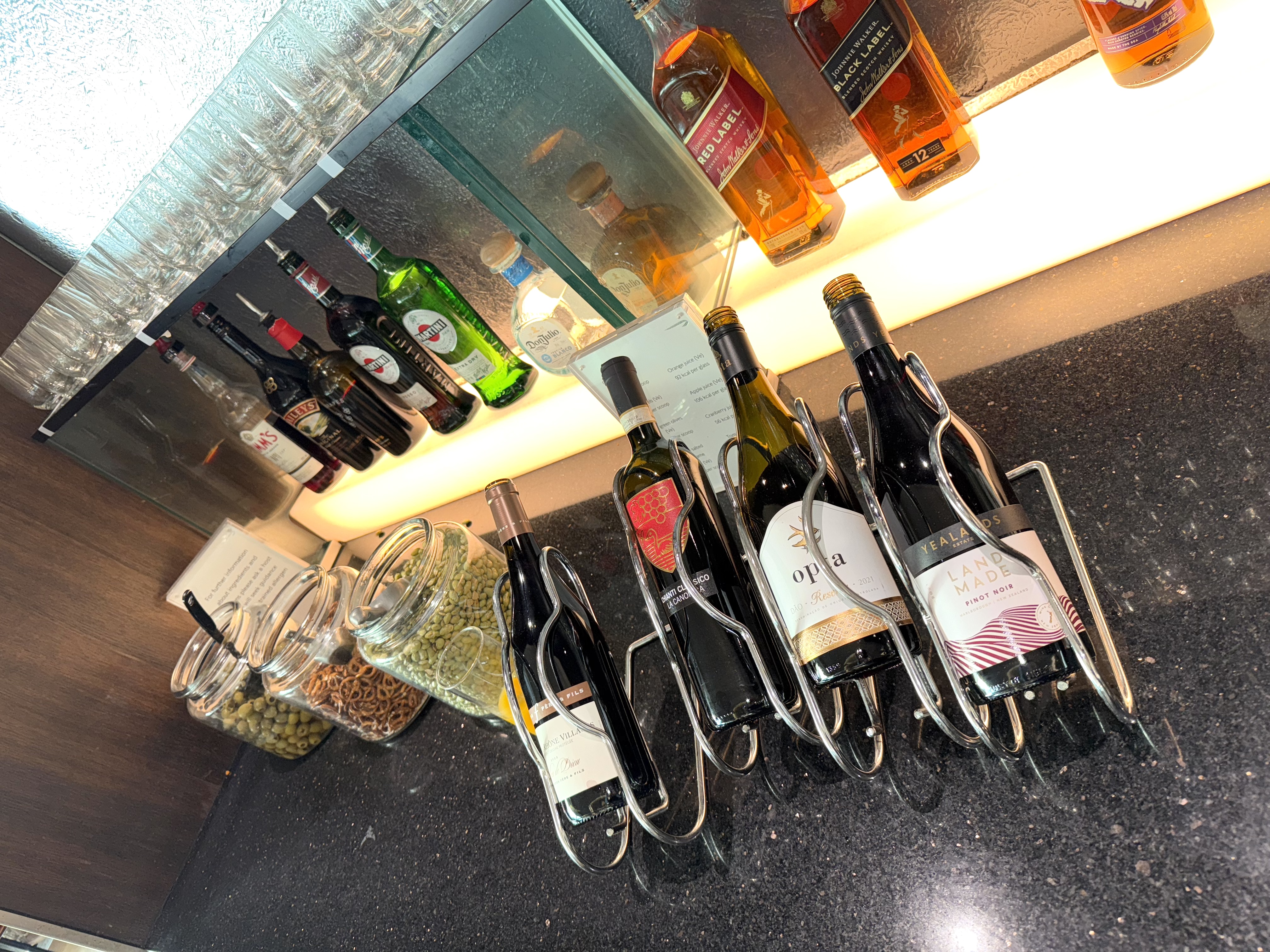 After an hour and a quarter, Heathrow Airport. Got there at 8:30. Our flight was to leave at 2:15PM. On the board were signs that indicated you could not check in to the flight until 2 hours before departure, which meant a wait of almost four hours. But then, we learned that business class passengers can go to another area in Terminal 5 and check-in at any time. Whew. Got to the British Air Executive Club at 9AM or so. Airline loyalty is not considered when in business or first class. You can enter the executive lounge of that airline. A truly outstanding assortment of food and drinks. As our flight was to leave at 2:05, we thus had access to a breakfast, then later, lunch buffet. The drinks assortment was first class, with scotch of Talisker and Johnny Walker Black. But a lot more.