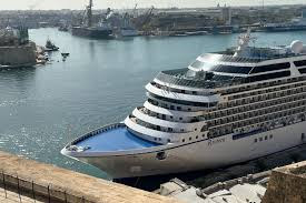 I've been on more than a dozen cruises, maybe two. Checking-in almost always involves standing in line, with long waits. Perhaps an hour or more. This time, a lot of personnel to get our luggage off the taxi and wheeled to the baggage check area. Then, maybe a five-minute processing period. We were on the ship ten minutes after we were dropped off by the cab. See the front of the Oceania Riviera? Our veranda is in the middle, second deck up, which is the 8th floor of this ship.
